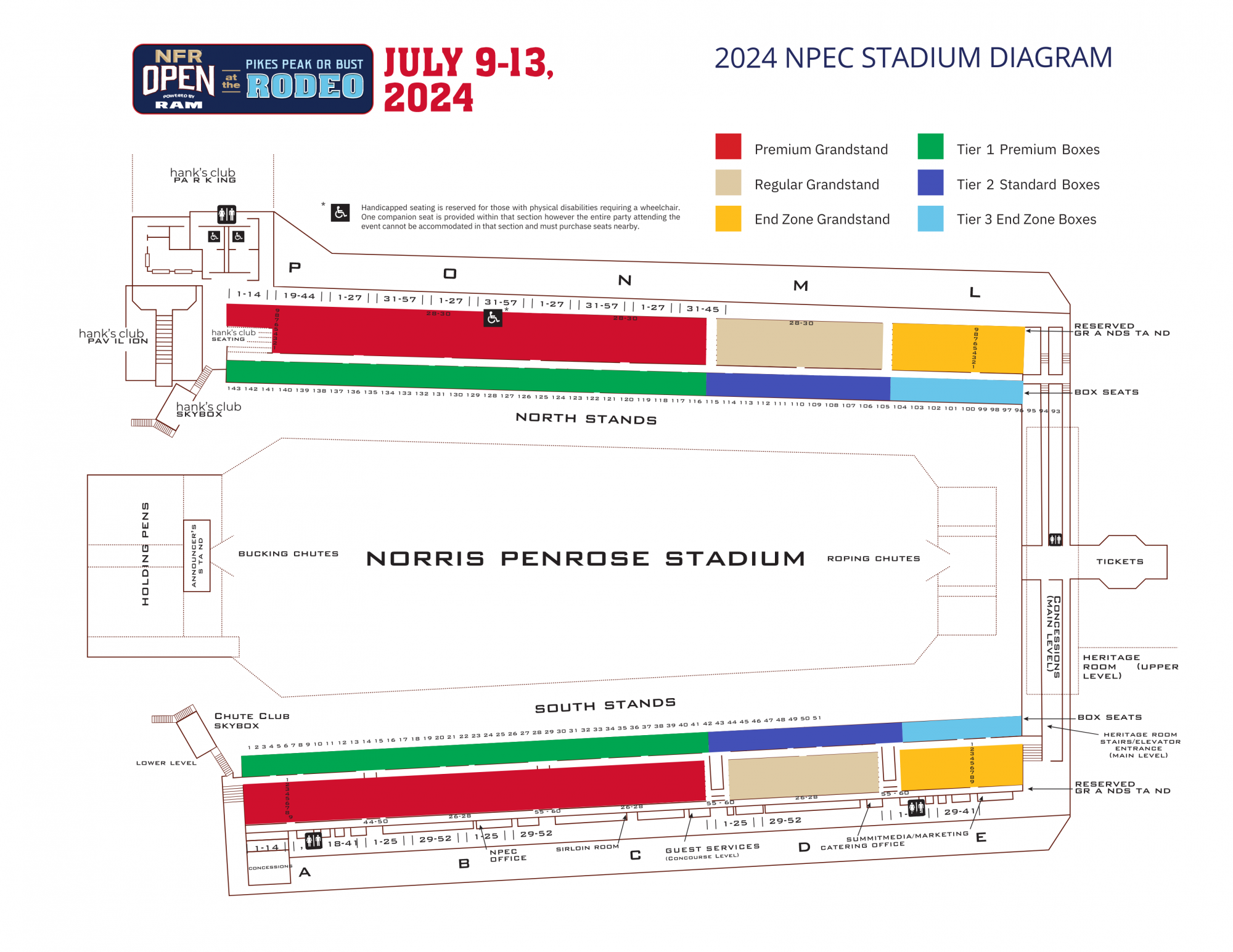 Tickets are available now and are moving quickly! To guarantee your place at this unforgettable event, secure your tickets online directly from PikesPeakorBust.org. Avoid inflated prices from ticket resellers and steer clear of scams – stick to the official website for genuine tickets at the best prices. Before choosing your seats, consult the color-coded stadium diagram provided above. Box seats provide the closest view of the action and are typically in high demand. Grandstand seats also offer excellent views of the excitement. End zone seating, situated in front of the roping chutes, still offers a good vantage point. With performances selling out in 2023 and anticipated to do so again this year, we advise purchasing your tickets as soon as possible.